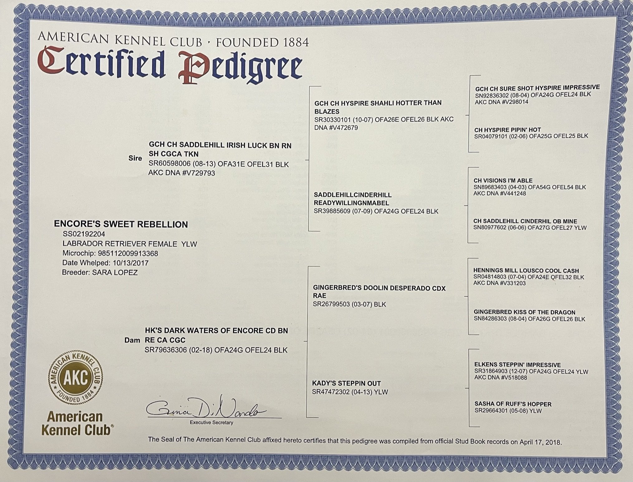 Pedigree Elbows Eyes Cardiac Hips OFA Full Clearance Report Kimber 2 years Kimber Junior Hunt Test Pass Kimber Working Service Dog Kimber Puppy